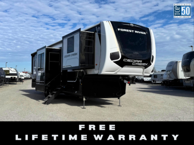 With any Cedar Creek fifth wheel by Forest River, you will find a quality-built RV with your comfort in mind! The all-aluminum super structure on 16" centers or less will provide a solid foundation to your fifth wheel, and the 3M bonded sidewalls will hold up and provide resistance to UV, heat, cold moisture, and even highway chemicals. Each model also includes a Road Warrior suspension for smooth towing, a 6-Point Hydraulic ,GEN 3 Leveling System, and a new 101" wide body frame. Inside, you'll enjoy walnut/two tone wooden cabinetry with hidden hinges, cutting board drawer with cut-out trash funnel, motion lighting in the bath and bedroom closet, plus many more comforts. The New Travelfi™ Pay-as-you go internet provides the ability to bring your own internet rather than relying solely on campground WiFi, and the "Rich Solar" 200W solar panel will give you off-grid capabilities!