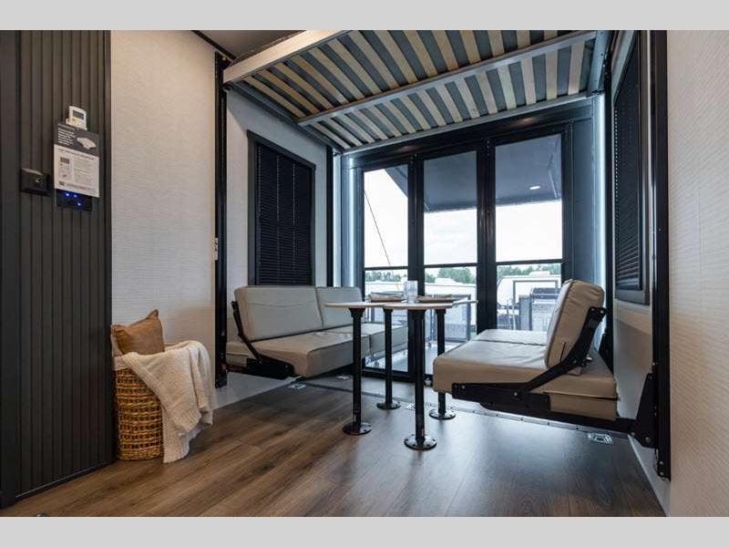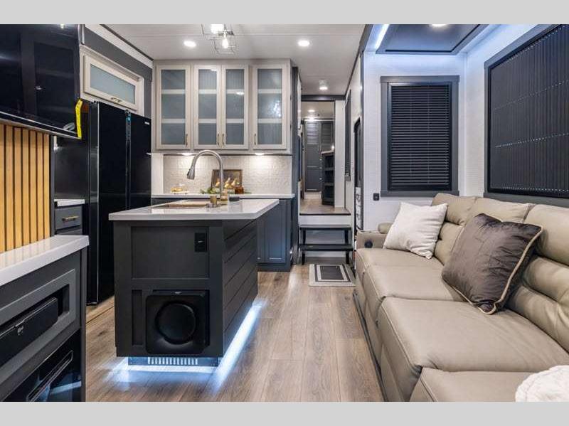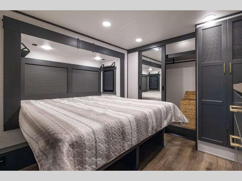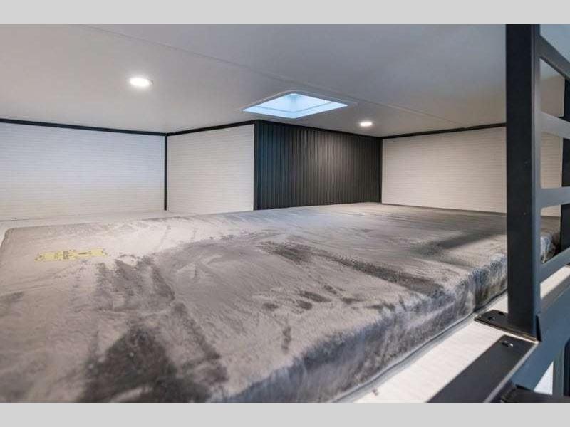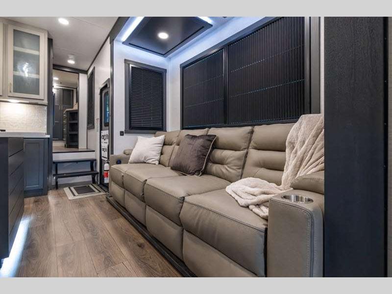 These toy haulers are 3/4 ton or 1 ton towable, and the additional height and width provides extra room for your toys to come along too. The MORryde CRE3000 suspension enhancement makes towing smooth and the hydraulic leveling will have you set up at camp in no-time. The contemporary interior design will make your space feel a little more like home and the Congoleum stain-resistant vinyl flooring is perfect for a toy hauler with dirt, gas, and oil being brought in.