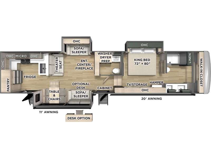 You won't believe all that this fifth wheel has to offer! Starting with the rear kitchen which has plenty of countertop space to prepare your delicious meals, a four burner cooktop with a stainless steel 24" oven to cook them, and a large single bowl stainless steel sink for easy clean up. The living area has opposing sofas and a theater seat with USB charging and storage across from an entertainment center with 50" Smart TV. The half bathroom is close to the living area so you can get back to watching your movie faster. You will feel right at home sleeping in the master suite on a slide out king bed across from a dresser and hamper to keep your space tidy, plus entrance into the front full bathroom. Inside the bathroom, you will find a vanity with dual sinks for two to get ready at once, a spacious shower with a seat, and a walk-in closet for clothes, shoes, and more!