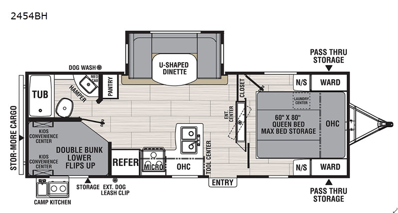 The whole family will love camping in this Northern Spirit Ultra Lite travel trailer, even the dog! Don't worry if your furry companion has too much fun in the dirt because you can easily clean them up at the exterior dog wash station. After you have whipped up your best meal with the three-burner cooktop and oven or at the outdoor camp kitchen, you can head to the U-shaped dinette and enjoy eating it there comfortably. Plus, the dinette can transform into an extra sleeping space if needed. The rear set of double-size bunks features a lower bunk that can flip up and two convenience centers for the kids. There is plenty of storage throughout the inside, but if you need more space, then head outdoors and store it in either the front pass-through storage area or the rear stor-more cargo area!