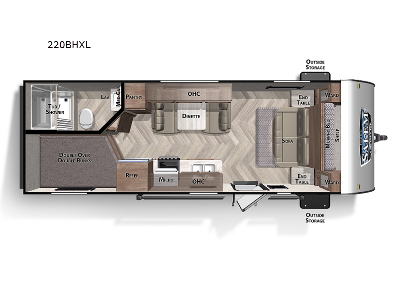 The whole gang can head to the campsite with this travel trailer! The kiddos can sleep on the corner double bunk beds and you can sleep on the front Murphy bed which can transform into a sofa for seating space during the day. You can also transform the booth dinette into an extra sleeping space when you're not using it to enjoy a meal that you made with the three burner cooktop. If there happens to be any leftovers, you can easily store them in the 6 cu. ft. gas/electric refrigerator. Everyone can start and end their days feeling clean and fresh with the rear corner bathroom that has a tub/shower and a medicine cabinet to store your accessories. You can also bring your favorite outdoor camping gear and store it in the front outside storage area!